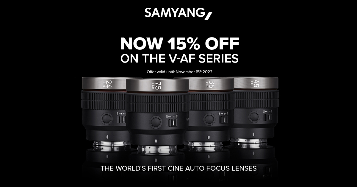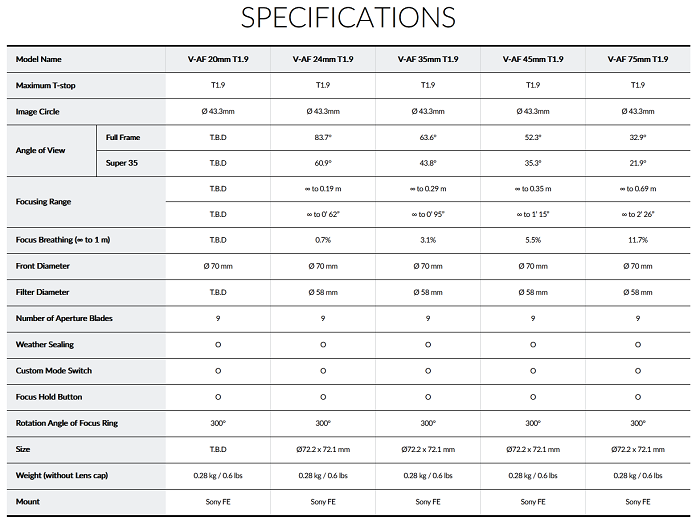 The V-AF series supports resolutions up to 8K in a small and lightweight form, which is well suited for use with handheld gimbals and drones, as well as for studios and location productions. All lenses within the new series are color-matched to avoid shifts when swapping lenses and the 9 aperture blades allow for a natural-looking bokeh.