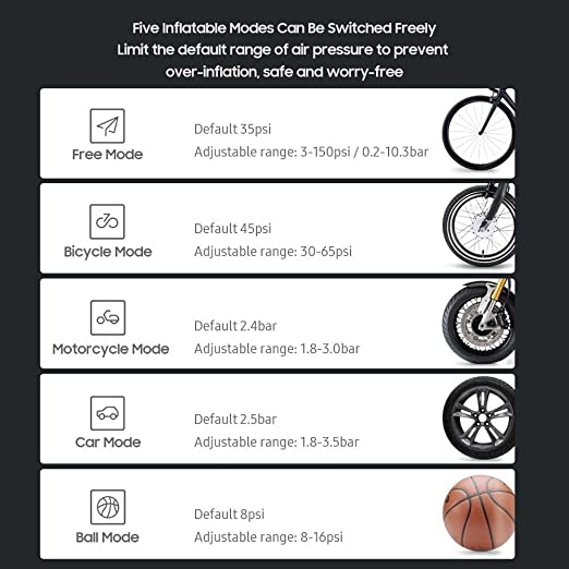 Moderns sūknis ar sešiem iepriekš iestatītiem riepu piepūšanas režīmiem. Nāk ar jaunu vārsta adapteri, spilgtāku gaismas avotu. Piepūšanas spiediens līdz 150 psi. Viegli uzpūtīs jebkuru riepu un bumbu.