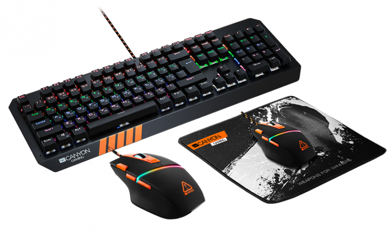 CANYON 3in1 Gaming set, Keyboard with rainbow LED(104 keys), Mouse with RGB(DPI 800/1600/3200/4200), Mouse Mat 350*250*3mm, Black RU layout