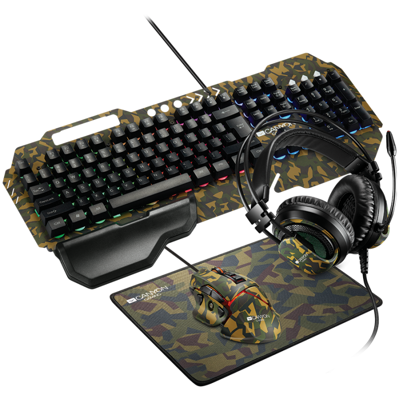 CANYON 4in1 Gaming set, Keyboard with backlight(104 keys), Mouse with weight adjustment(DPI 800/1000/1200/1600/2400/3200/4800/6400), Mouse Mat 350*250*3mm, Black, US