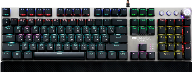 CANYON»Wired Gaming Keyboard,Black 104 mechanical switches,60 million times key life, 22 types of lights,Removable magnetic wrist rest,4 Multifunctional control knobs,Trigger actuation 1.5mm,1.6m Braided cable,RU layout,dark grey, size:435*125*37.47mm, 840g»(new)
