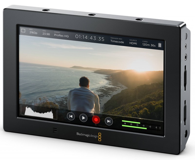 The built in monitor is also an interactive touchscreen that makes setting up the Blackmagic Video Assist incredibly intuitive. All of the functions are at your fingertips allowing you to use simple swipe gestures to display camera information, change settings and evaluate audio and video levels. The elegant heads up display is a semi transparent overlay that let’s you change recording formats or view the current input frame rate, histogram, audio meters, timecode, and more, all while still keeping your eyes on the shot!