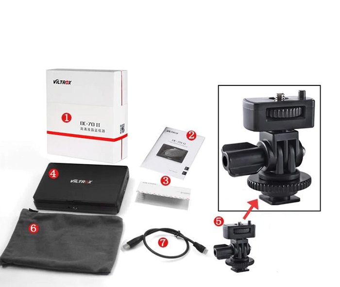 Viltrox DC-70II Clip-on LCD Monitor has angle adjustment shoe adaptors, theyfulfill the different angles need in