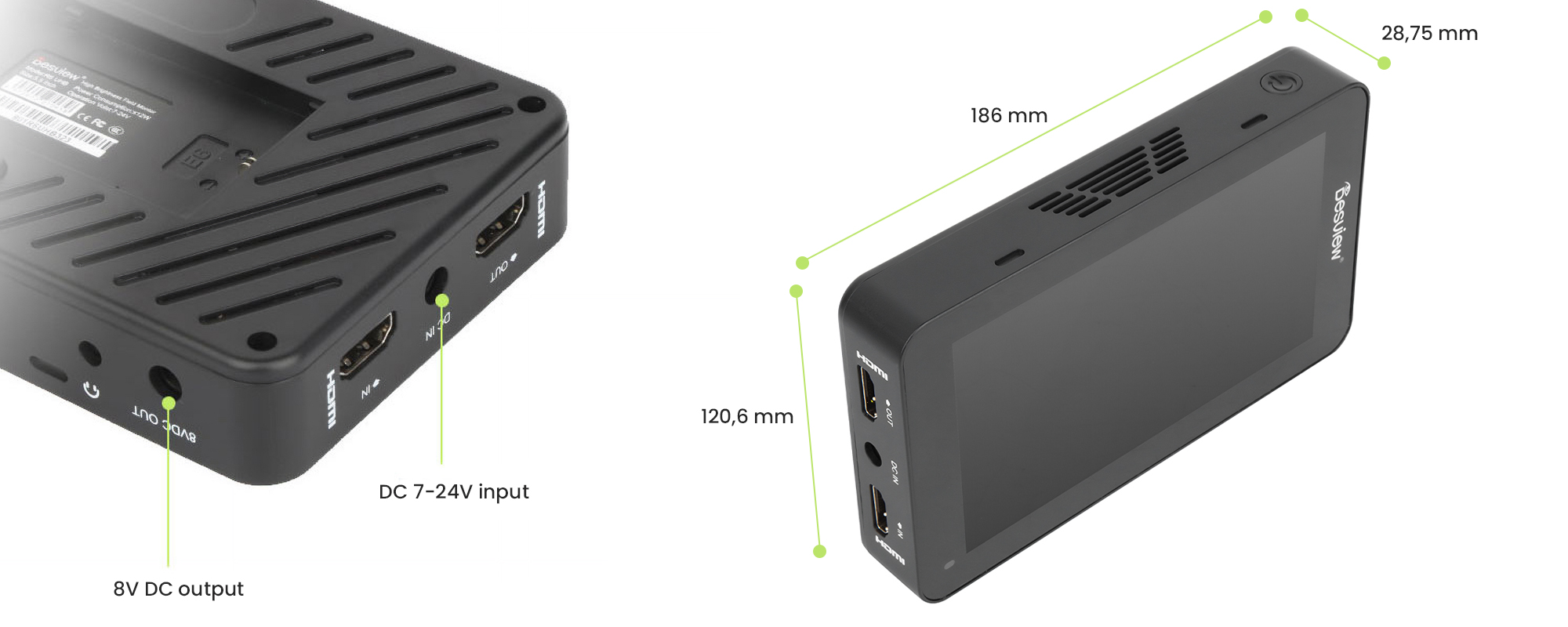 The Desview R6UHB preview monitor will work well both in the studio and outdoors. This is because the device supports various power supply methods. If you have an electrical outlet nearby, reach for an AC adapter (7-24V DC). And when you are working in the field or want to avoid tangled cables, use a rechargeable battery. A special locking socket supports 2 different types of cells – NP-F and LP-E6. The monitor is also equipped with a DC 8V output, which you can use to power other compatible devices (e.g. by connecting a “dummy” battery placed in the camera).