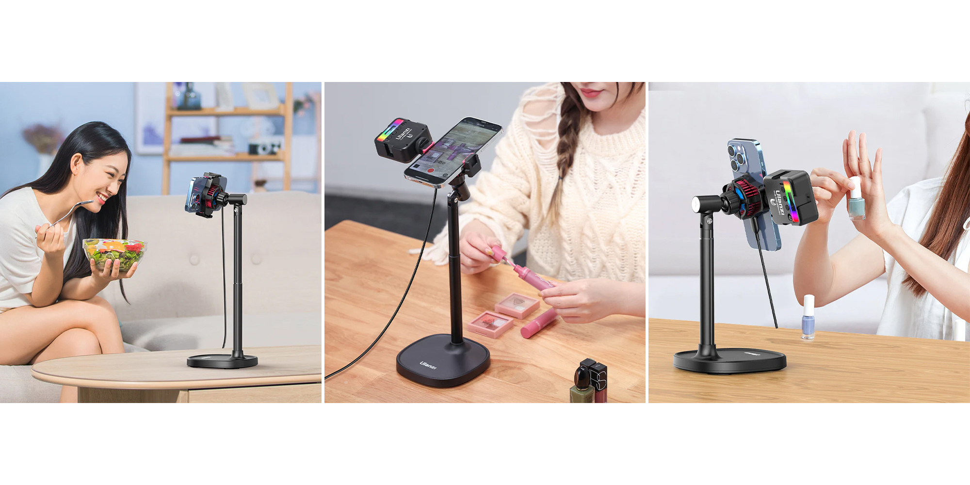 The Ulanzi SK-06 mount fits most smartphone models thanks to its adjustable clamp (from 65 to 89 mm). In addition, the 360º ball head allows multi-directional adjustment and customisation of the viewing angle. The sturdy telescopic mount offers a height of 185 to 305 mm, making the device ideal as both a desk stand and mobile mount.