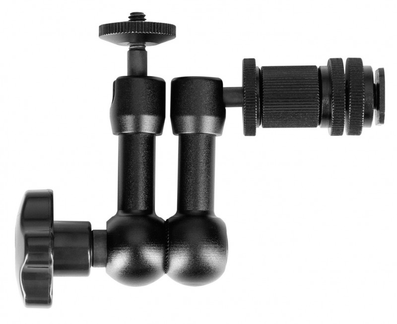 The arm allows you to mount and set in almost any position accessories with a weight not exceeding 1kg. By means of one convenient knob we block all movable parts of the arm. The arm heads are equipped with a standard 1/4 inch male tripod mount, compatible with most photographic and film equipment. An additional mandrel with a cold foot allows you to directly install the accessory on the sled of the camera.