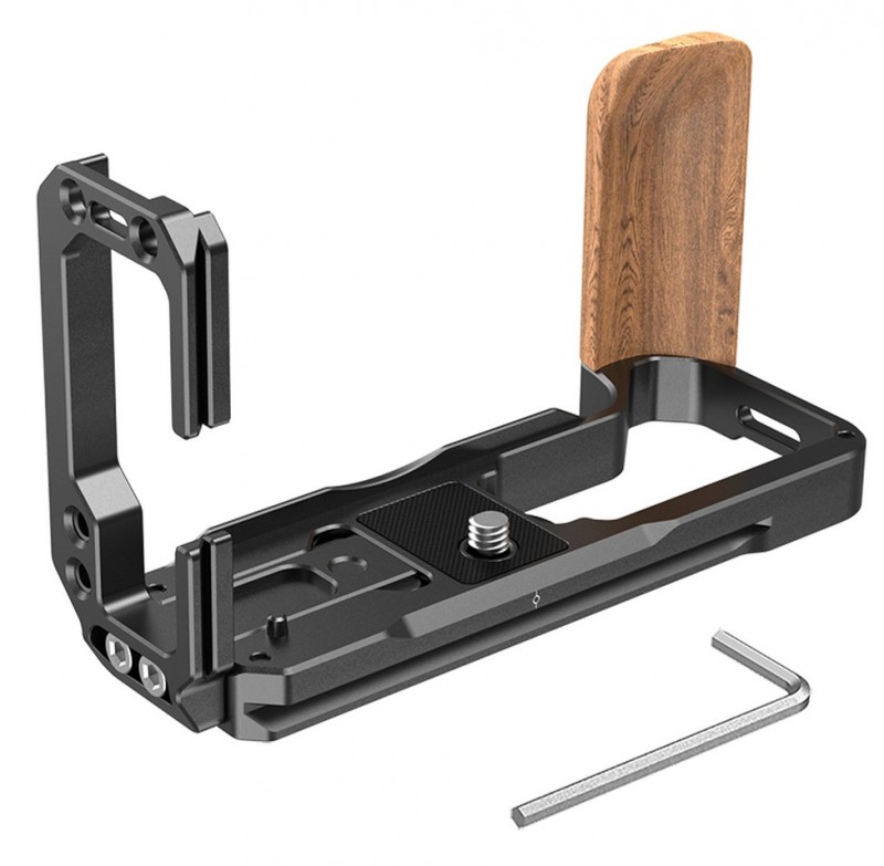 SmallRig L Bracket for FUJIFILM X-T4 Camera LCF2811 is modular designed with anti-twist flanges to keep the camera from twisting and provide a comfortable grip. Both the base plate and side plate are Arca-type compatible dovetails enable the camera to mount in a vertical or horizontal position. It secures to the bottom of the camera with a 1/4 screw and an anti-twist locating pin prevent twisting. The wooden side grip would make it easier to handhold the camera. Each axis features a sensor centering line to align the camera on a tripod head. The side plate can be extended to left if more room is needed for tethering or cable release. Additionally, the L plate features multiple 1/4"-20 threaded holes on the side and bottom for accessory attachment such as Cold Shoe 1593 and Cable Clamp 1822. A flat head screwdriver is included to secure the camera screw and stores on the bottom of the L bracket.