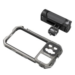 SmallRig Handheld Video Kit for iPhone 13 Pro Max is a perfect mobile phone video rig for vlogging, mobile filmmaking, commercials, etc. The kit comes with a cage specially designed for iPhone 13 Pro Max and a side handle for a more stable handheld phone shooting. The cage features 1/4"-20 anti-twist threaded holes and cold shoes that support accessories. It supports M-mount or 17mm threaded lenses by replacing the backplane. It gives access to iPhone buttons, ports, radar and ultra-wide angle lens thanks to its hollow design. The metal full cage with built-in shims prevents scratches, reduces vibration. The cage enables horizontal and vertical shooting.