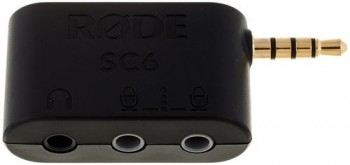 The SC6 is an input/output breakout box for smartphones and tablets. With two TRRS inputs and one stereo headphone output, the unit connects to any TRRS device and allows the use of one or two smartLav microphones as well as headphones for monitoring and playback. With the SC6 users can monitor audio from the smartLav, as well as input two smartLavs into the one mono channel in interview or dual-dialogue scenarios. (Note that the two microphone inputs will be recorded to the same channel)
