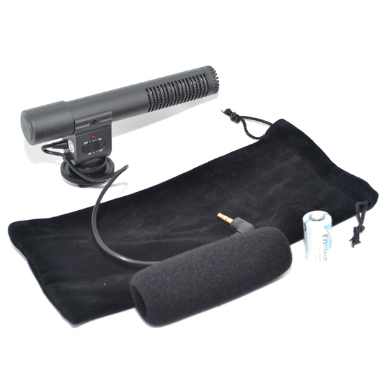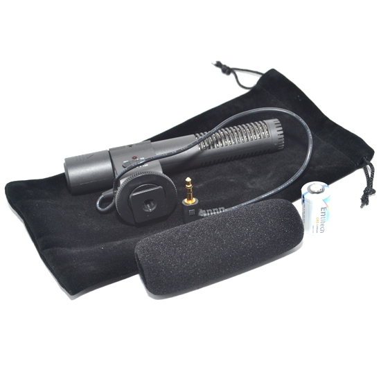 The microphone is a stereo microphone which ensures a clean and sharp sound with a wide range and high frequency response. This microphone is powered (supplied as standard) by a CR2 battery. Also included as standard is a windshield for the microphone, which ensures that you experience less wind noise in your recording.